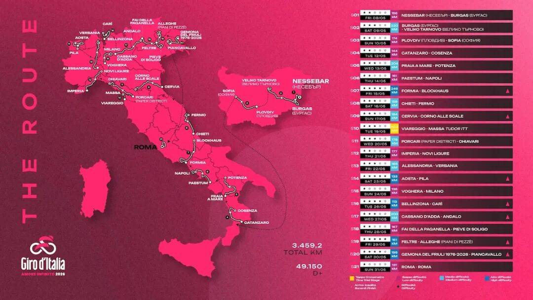男子环意计划于明年5月8日在保加利亚发车,并在该国进行三个赛段。保加利亚首都索非亚距离罗马约1200公里。这将是环意连续第二年海外发车(去年为阿尔巴尼亚),也是自2022年以来第三次在国外起跑。