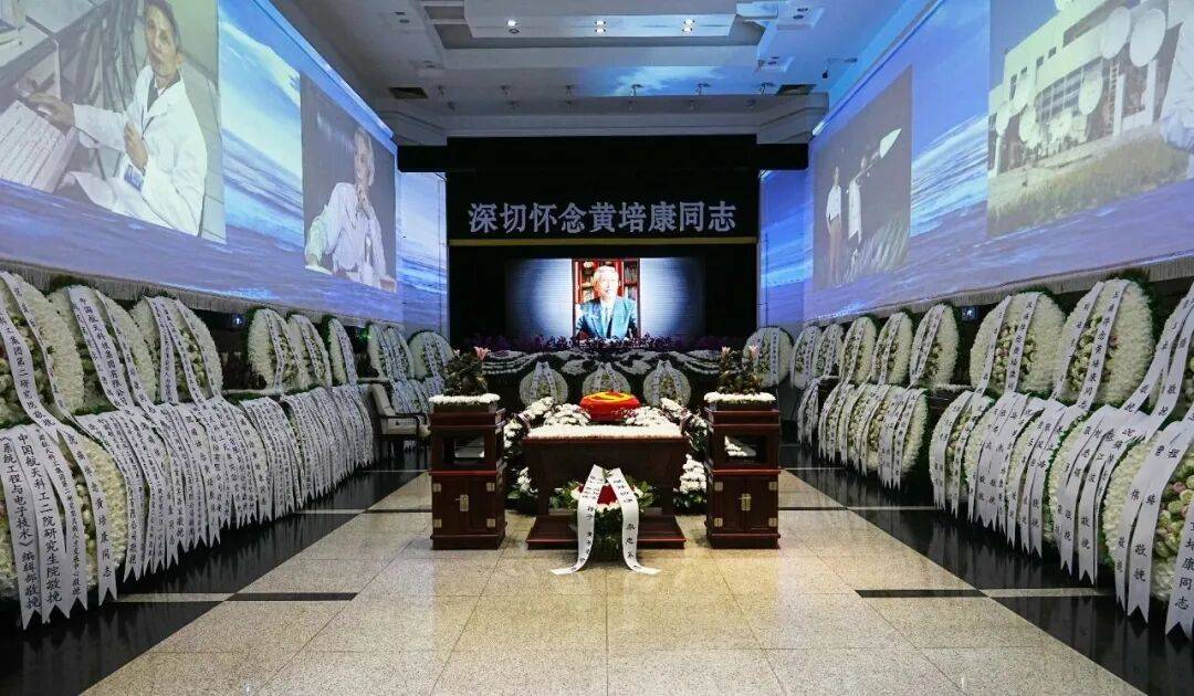 八宝山殡仪馆东礼堂庄严肃穆,哀乐低回。正厅上方悬挂着“深切怀念黄培康”的黑底白字横幅,下方悬挂着黄培康的遗像,目光睿智而安详。在鲜花翠柏的簇拥下,黄培康静静安卧,身上覆盖着中国党旗。