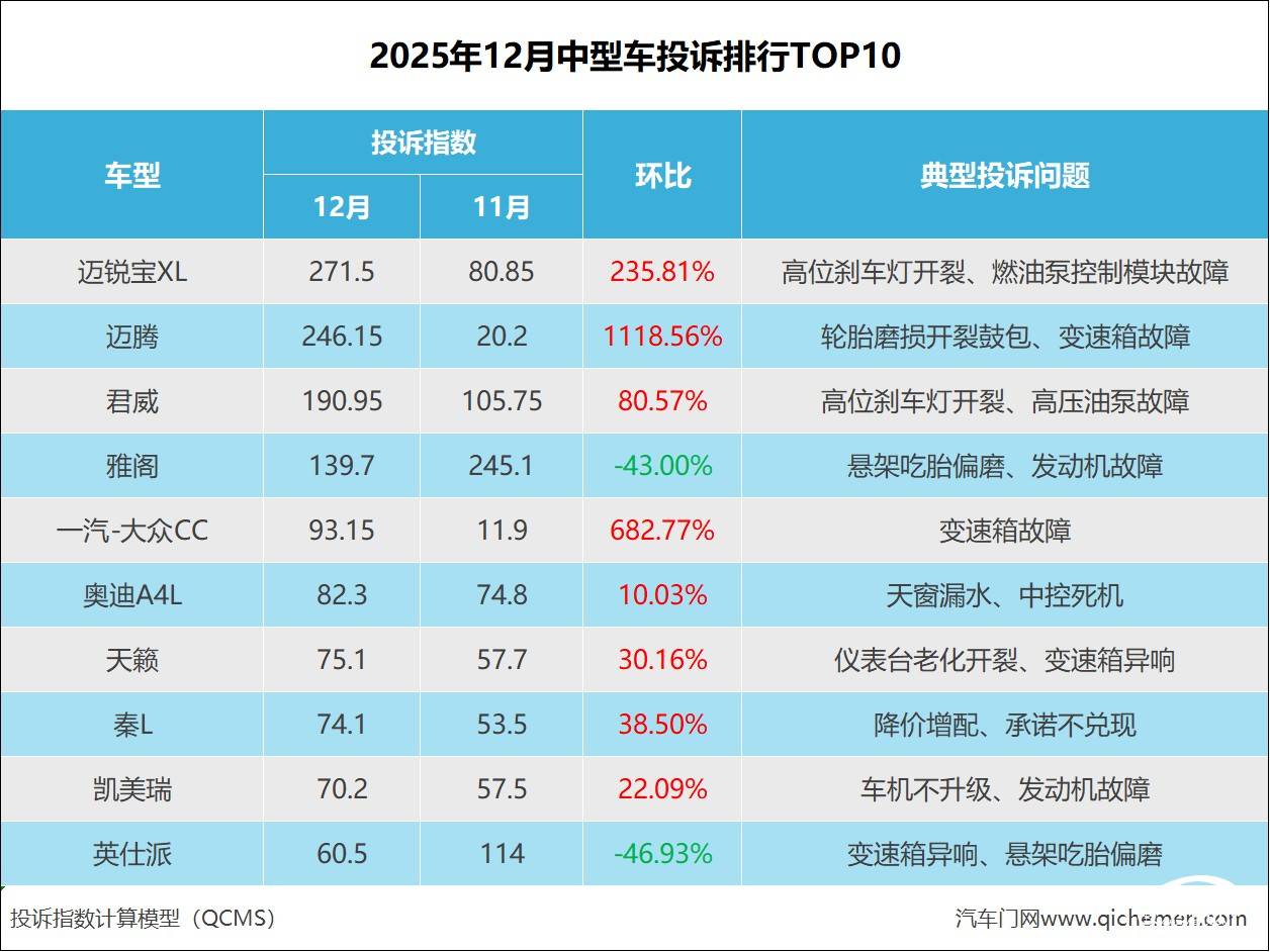 博鱼,博鱼体育,博鱼官方网站,博鱼体育登录入口,博鱼官网,博鱼体育登录入口,博鱼体育官网,博鱼体育下载,博鱼app下载,博鱼注册网址,博鱼体育官方网站,博鱼app,博鱼体育入口转眼间,2025年进入尾声,迎着2026年的脚步,12月中型车投诉指数出炉。数据显示,中型车总体投诉指数为2331.05,环比暴涨38.08%。在本月投诉榜TOP10中,投诉指数上涨车型豪取8席,其中涨幅最大车型为大众迈腾,暴涨1118.56%,位居榜眼位置。深究原因,变速箱紧急状态故障成了直接因素。该问题在大众多款车型中都有出现,可能存在设计通病。而两款投诉指数下跌车型中,英仕派降幅最大,有着46.93%的降幅,相较上月服务态度差的投诉明显减少,变速箱异响的投诉有些许增涨。