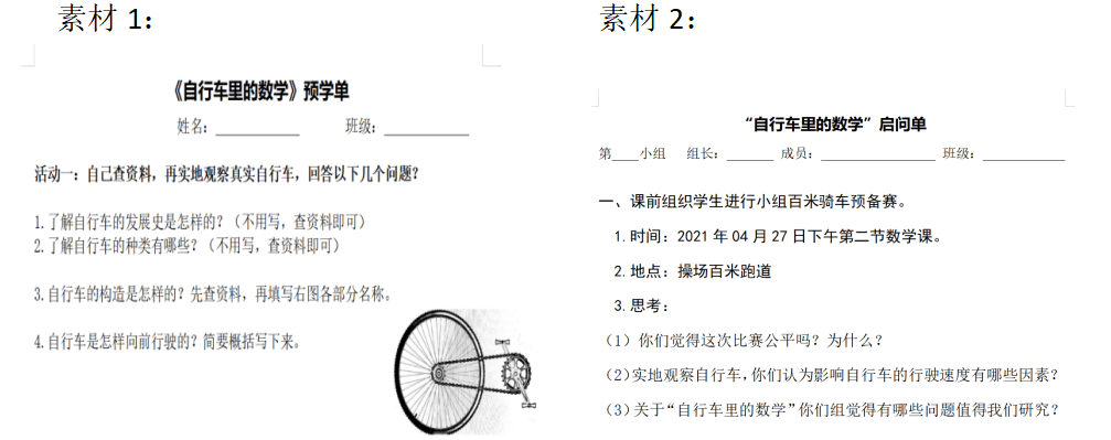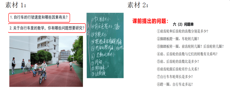 通过前测,我了解到虽然学生对自行车早已司空见惯,但大部分学生还是缺乏对自行车的仔细观察和深入研究。为此我精心设计了预学单,并在预备课上通过观看微课,实地观察等方式,帮助学生系统地了解自行车的相关信息和知识点,并组织“百米自行车骑行比赛”,通过启问单,引导学生思考:①自行车的行驶速度和哪些因素有关?②关于“自行车里的数学”,你觉得哪些问题值得研究?经过这一系列的预备学习和体验活动,为接下里深入研究本节课埋下伏笔。
