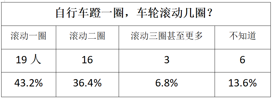 为了解学生的真实认知起点,我设计了一个前测问题——自行车蹬一圈,车轮滚动几圈?全班44人进行前测,前测情况分析如下表: