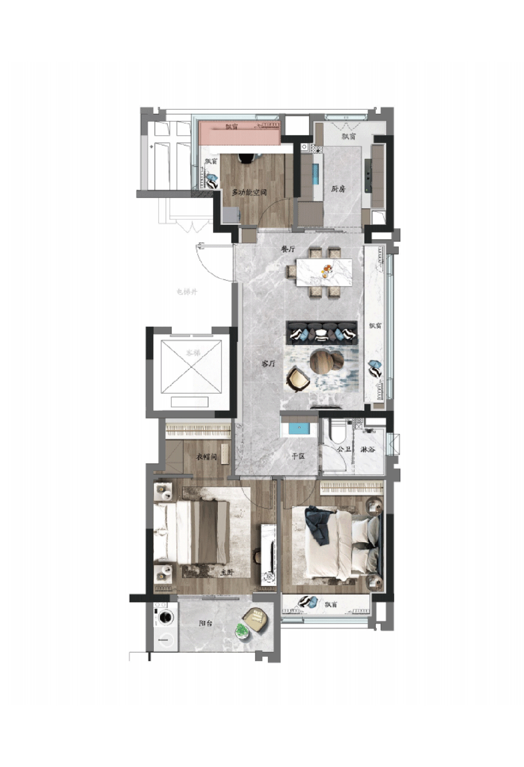 第三,整个户型几乎是“0走道”,拒绝空间浪费,以至于整个户型的各个空间尺度感都非常出众。