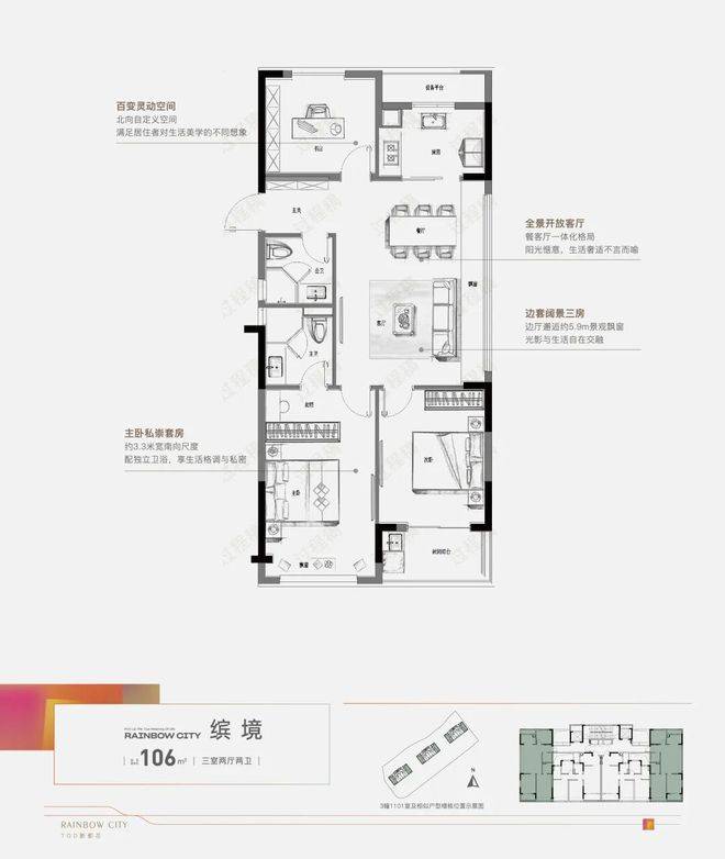 边套户型,这在同面积段中尤为罕见。户型方正,客餐厅拥有约5.9米长飘窗,推门而入便能感受到极佳的视野与光线,居住舒适度大幅提升。