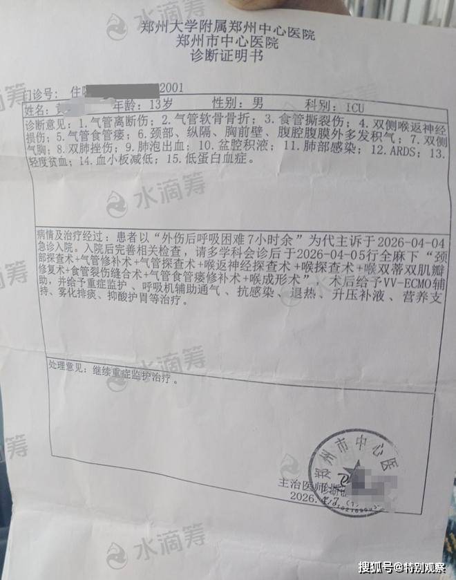 经过抢救,小宇勉强恢复生命体征,随后又被紧急转往郑州大学附属郑州中心医院,被诊断为气管断裂、严重颈部创伤、气道贯通伤以及肺内积血。“医生为小宇进行了气管连接手术,但仍有一段气管未能找到,后续还需要多次手术治疗。”