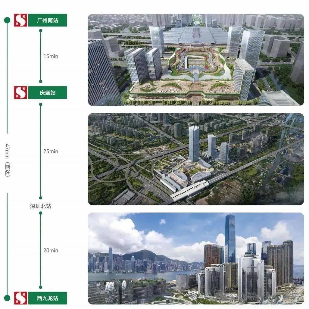 广深港高铁上汇聚新鸿三大TOD地标巨作(南站ICC-庆盛枢纽TOD-西九龙高铁站上盖发展项目),一轨之上港穗互联,比肩世界,实现双核驱动赋能发展。